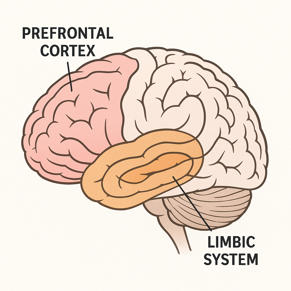 The human brain grew in layers and the prefrontal cortex arrived at around 2 million years ago, sitting above and in front of the older limbic system. The limbic system, being our ancient brain, is involved in behavioural and emotional responses - focusing on functions to keep someone alive, such as feeding, reproduction, caring for the young and the flight-or-fight response.