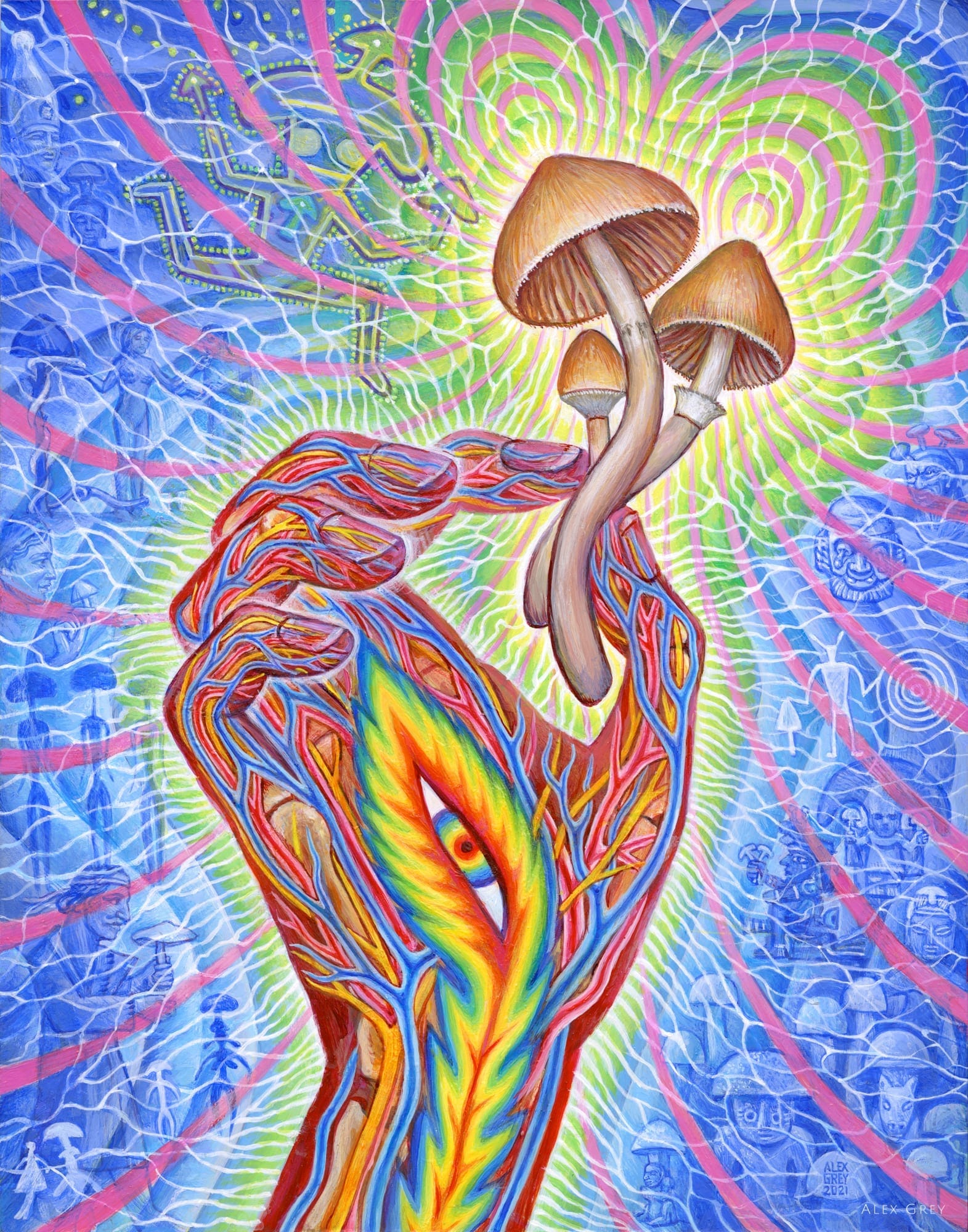 How odd that a chemical produced in our own bodies, when consumed can have such a deep experience that you see exactly what Alex Grey Godself depicts. What, maybe three hits of dmt? And now you are having the most mind bending and eye opening experience of your entire life. Why is that?